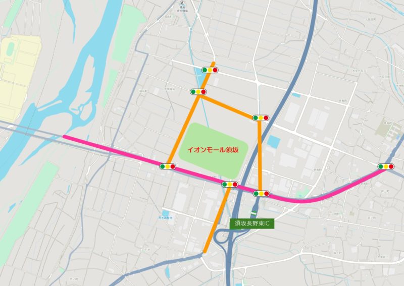長野市と須坂市を結ぶ主要道路の一つである「県道58号(須坂長野インター線)~国道403号」(ピンク線)、および「イオンモール須坂の周辺道路」(オレンジ線)が渋滞の中心になると予想されます。