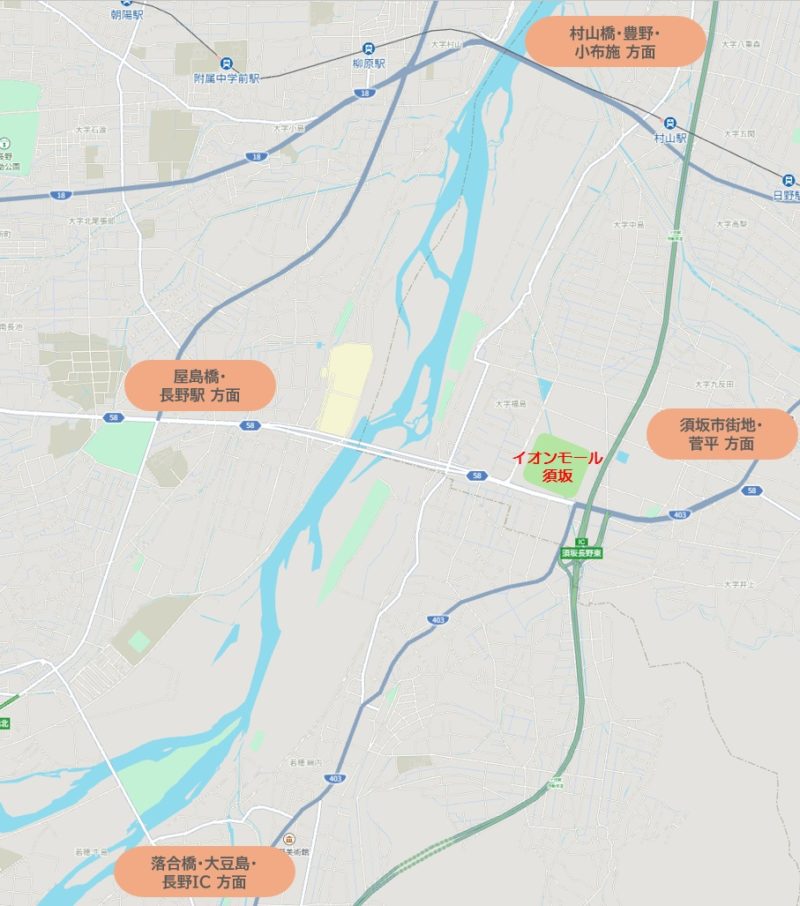 渋滞が予想される県道58号(長野須坂インター線)を通ることになりますが、屋島橋を下った直後に左折すると、県道347号をとおって幸福ライン(イオンモール須坂の北側)に出れます。