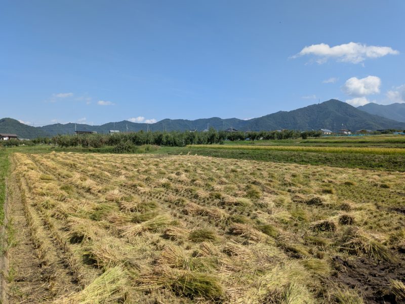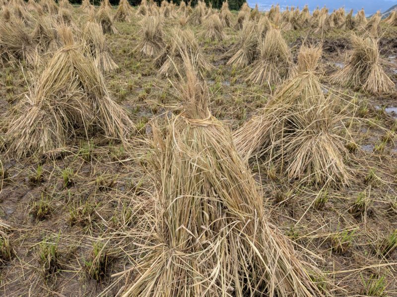 稲刈りが終わった田んぼには、脱穀を終えた稲の藁が束ねられて並んでいます。